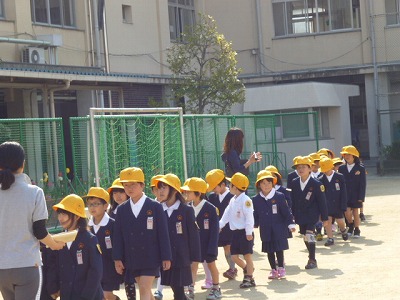 2〜6年生が整列して待っている中、1年生が拍手の中、入場です。