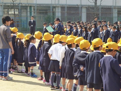 4月9日の1時間目に1年生と2〜6年生との対面式を運動場で行いました。