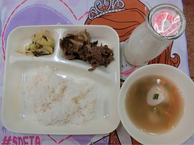 うす切りの牛肉と玉ねぎ、ピーマンがニンニク風味のある甘辛いたれにからめられて焼かれていて、子どもたちに大好評でした。