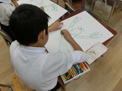 1学期より飼育していた「ザリガニ」。いつになったらモデルになるのかと心配していましたが、ようやく、モデルデビューです。