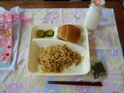 給食2日目の献立は、焼きそば・きゅうりの中華あえ・黒糖パン・牛乳です。