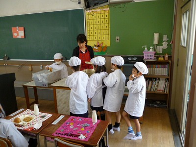 今日は、先生に教えてもらいながら、自分たちでパンや牛乳を配膳しました。