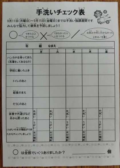 今週は手洗い強調週間です。いつもより、意識をして、ていねいに手を洗いましょう。そしてチェック表には「○」がたくさんつくようにしてくださいね。