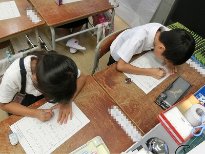後半は班での協働学習です。班のメンバーにそれぞれが書いた言葉を教え合い、班で15個の言葉を集めます。どの班が早く完成するか、とっても盛り上がっていました。