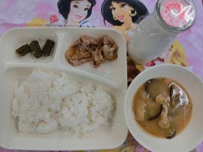 みそ汁は、うすあげ、ナス、かぼちゃ、えのきたけが具材です。ナスがかなり多い目に入っていたので、ナス嫌いの児童さんにはつらかったですね。