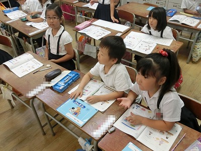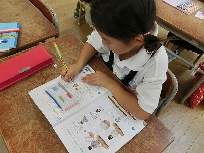 「どちらが ながい」という単元の学習で、きょうは、1cmの方眼用紙上に置かれた鉛筆やマジック、消しゴム、パスが、マスのいくつ分あるかを調べ、長さを調べていました。