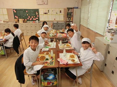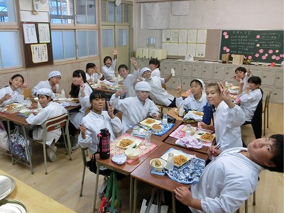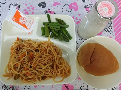 イタリアンスパゲッティは、子どもたちが大好きな「ウインナー」がたっぷり入っていました。他にも、玉ねぎ、にんじん、ピーマン、マッシュルームと具だくさんで、ケチャップ味のいわゆる「ナポリタン」です。子どもたちは口の周りをケチャップ色に染めながら、大きな口をあけて、おいしそうに食べていました。当然、パンにはさんでいる子もたくさんいました。