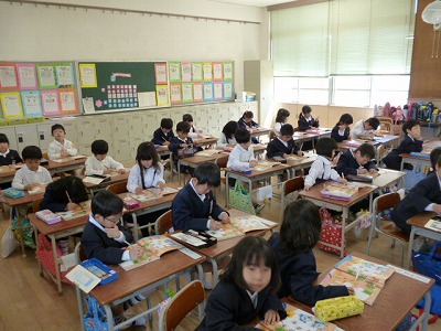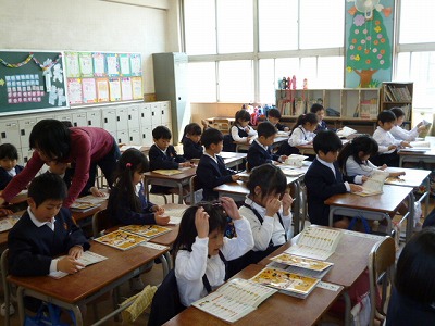 机の上に教科書を置く位置や、本を読むときの姿勢などについて学んでいました。