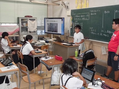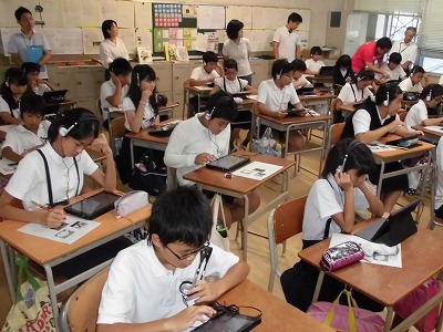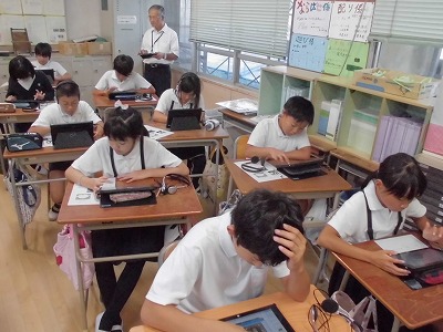 社会科で「天下統一した武将について調べよう」という学習でした。、タブレットを一人一台使用で、織田信長、豊臣秀吉、徳川家康の中から一人を選び、各武将に関連したビデオ映像を視聴したのち、発表ノートでスライドを作成し発表しました。