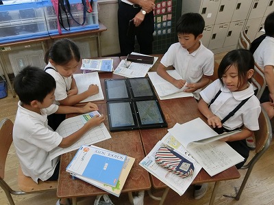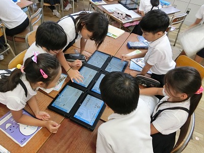 社会科で「買い物で調べてきたことをグラフや地図にまとめよう」という学習でした。タブレットを一人一台使用で、4人〜6人のグループで画面を合体させ、豊新地域の地図を大きく拡大して、その地図に買い物をしたお店をマークしていきました。この「画面合体」機能は、授業で初めての活用なので、子どもたちも驚いていました。