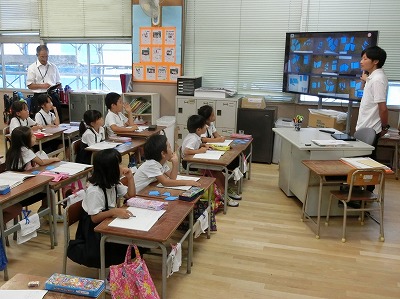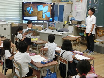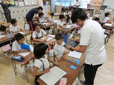 算数で「形をしらべよう」という学習でした。形カードを8枚配り、ペアで理由も考えながら仲間分けをしました。先生がその仲間わけの様子をタブレットで写真に撮り、大型モニタに映し出して比較し、子どもたちがそれぞれの分けた理由を発表しました。この授業より「三角形」「四角形」ということばが登場です。