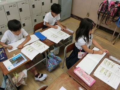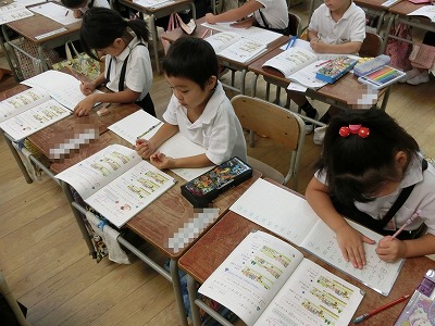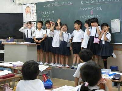 今日は、「ひき算」9−3−4 などの問題に挑戦です。「ねこは なんびきに なりましたか。」の問題で、デジタル教科書や、さらに、実際に子どもたちが前に出てきて、解き方を考えていました。