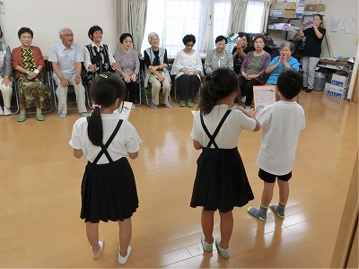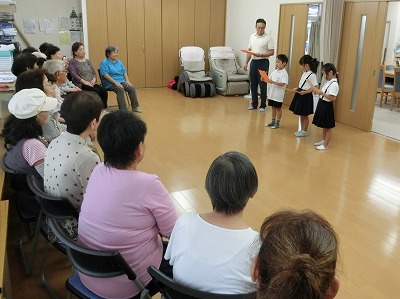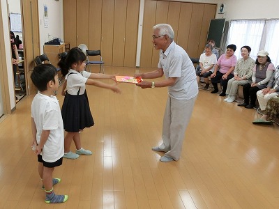 敬老の日に向けて、2年生が地域のお年寄りの人たちに書いたお手紙を、学年の3名の代表児童が「豊新憩いの家」に持って行き、敬老会の方にプレゼントしました。