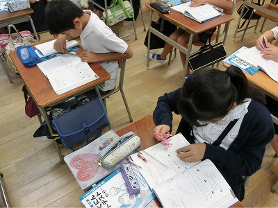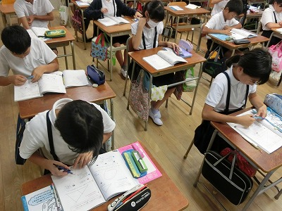 コンパスと定規をていねいに使って、意外と簡単に子どもたちは図を書いていました。