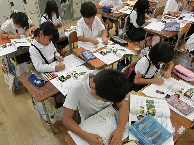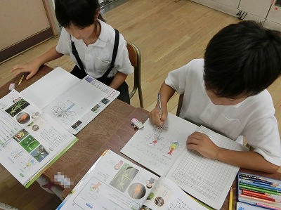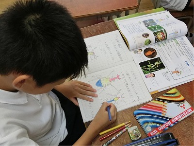 今日は「こん虫のすがたとすみか」の「すがた」部分で、こん虫は「頭」「むね」「はら」からできていて、足は6本「むね」から生えていること、「頭」には、「目」「しょっ角」「口」があること、「はら」には「ふし」があり曲げることができることなどを学びました。