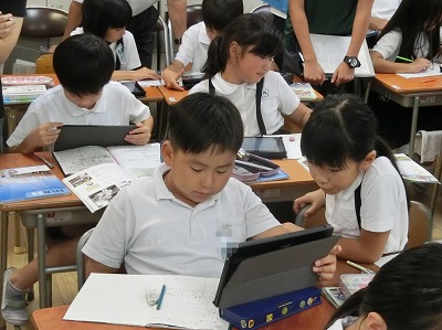 今日の授業は、前回までの授業を振り返りながら、先生の示す大型モニタと、一人1台のタブレットを活用し、年間を通してのぶどう作りの作業工程について、「写真」「農事ごよみ(資料)」「ビデオ映像」から読み取り、ノートにまとめていました。そして、ペア学習で意見の共有活動も行いました。