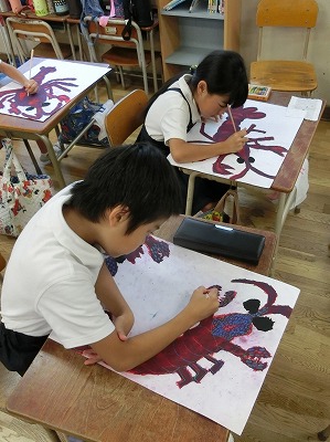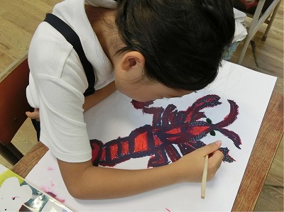 今日は、青色の上に赤色のパスをかぶせて描いたザリガニの絵に、先を鉛筆のようにとがらせた「割り箸」を使って、ザリガニのツメや頭部の細かな模様を、クリクリを小さく動かしながらパスをはぎ取っていく作業をしていました。