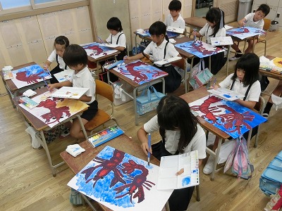 後半は、水彩絵の具を用いて、背景の色付けでした。水をイメージして「青色」ベース、土をイメージして「茶色」ベースで、トントンと筆で絵の具を置いていく技法で描いていました。完成までもう少しです。