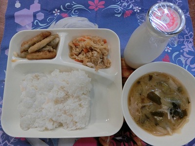 みそ汁は、豚肉、キャベツ、玉ねぎ、もやし、オクラ、わかめが具材でした。おくらのとろみも出ていておいしかったです。また、とっても具だくさんでした。