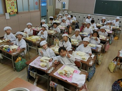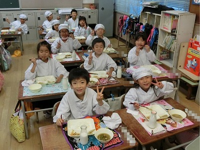 切り干し大根の炒め煮は、うすあげとにんじんも入っていました。苦手な子も多いかと心配しましたが、出汁がしっかりとしみこんでいたので「いい味してる」「おいしい」と評判でたくさんお替りをしてくれました。