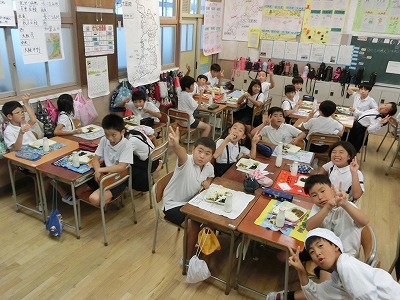 ぶどう(巨峰)は、基本4粒ずつでしたが、今回も、どのクラスも食缶に多い目に配膳されていたので、お替りでいただき喜んでいました。とっても甘かったです。