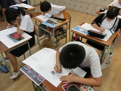 このクラスでは、先生に印刷してもらった写真を見ながら鉛筆で下絵を描いていました。しかし、細かい部分、わかりにくい部分があるということで、各自でタブレットを使い、インターネットで画像を検索し、出てきた写真を拡大して写し出し、描いていました。