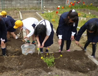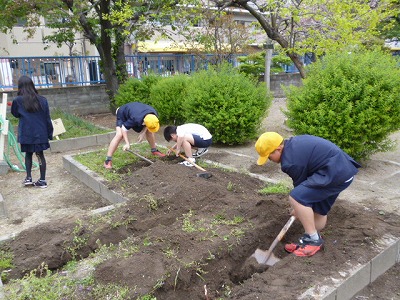 放課後、6年生の理科係が中心となって、校庭にある学習園の整備と、ジャガイモの種イモの植え付けを行ってくれました。