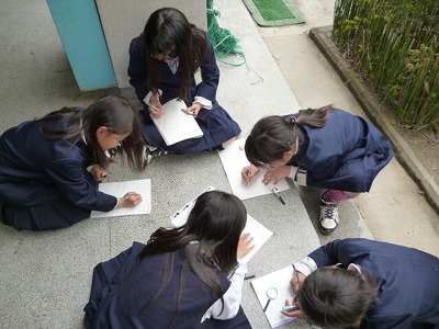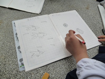 このグループは、職員室前のビオトープ(池)の金魚やメダカ、周辺にいたダンゴムシなどをスケッチしていました。