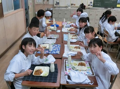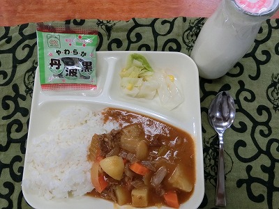 ハヤシライスは、たくさんの牛肉、じゃがいも、ニンジン、玉ねぎ、セロリ—が入っていました。カレーがちょっぴり辛いと感じている低学年さんも、これなら大丈夫です。今日は低学年さんも、食べるスピードが早かったです。高学年さんに聞いてみると、カレーの方が人気のようでした。また、ラッキーニンジンも入っていました。星形やハート型を見つけては、大喜びしていました。