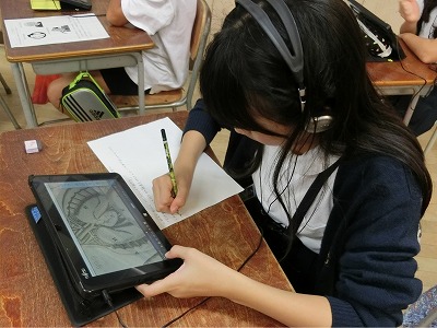 その後、自分の興味のある人物についての映像(NHK for school)を視聴し、画面をキャプチャーし、発表ノートでスライドを作成する授業でした。さすが6年生、子どもたちも何度目かの作業なので、どんどんと発表用のスライドを作成していきます。