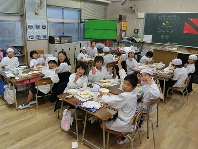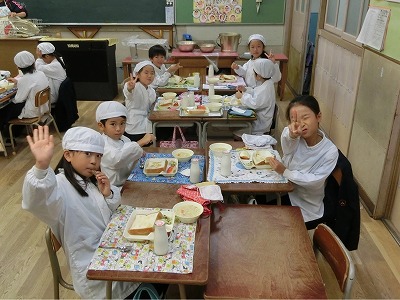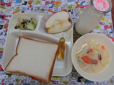 コーンクリームシチューは、アレルギー対応食で、小麦粉ではなく米粉を使って作られていました。コーンたっぷりはもちろんですが、鶏肉、ベーコン、ジャガイモ、玉ねぎ、にんじん、グリーンピースなどの具材もたっぷりでした。とってもおいしくて、すぐに食缶は空っぽです。ラッキーニンジンにも子どもたちは大喜びです。