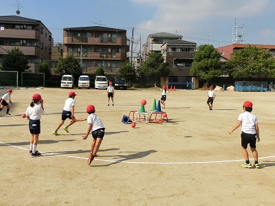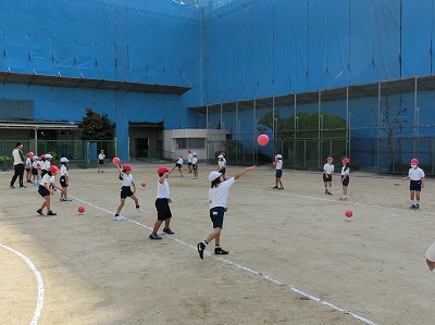 まずは、ペアで5m離れた相手の胸元にきちんと投げる、飛んできたボールを両手とお腹や胸を使って受け止める練習をしました。以前に見た時と比べ、随分と良いボールが投げられるようになっていました。また、キャッチも上手でした。