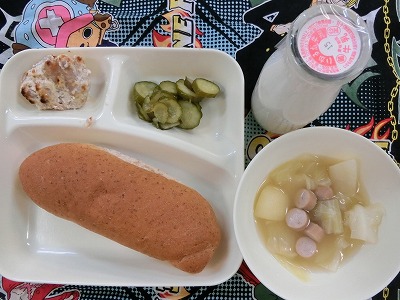 スープ煮は、チキンスープに、じゃがいも、キャベツ、玉ねぎのたっぷりの野菜、さらに、子どもたちの大好物のウインナーが入っていました。また、野菜の甘みもスープに出ていて、野菜も軟らかく煮込まれていておいしかったです。
