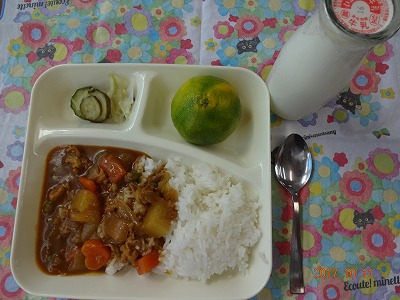 ポークカレーライスは、アレルギー対応献立で、米粉を使ったカレールーで作られています。豚肉、たまねぎ、にんじん、じゃがいも、グリンピースが具材です。ポークカレーライスも子どもたちの大好きなメニューの一つであり、競うようにお替りをしていました。
