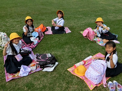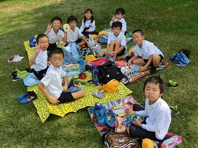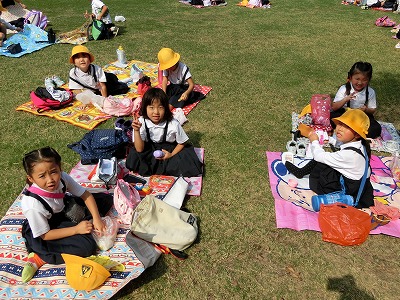 芝生広場で仲良しのお友だちとレジャーシートを広げ、作っていただいたお弁当を、みんなで楽しそうにお話をしながら食べていました。