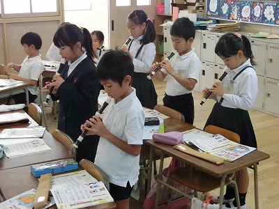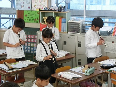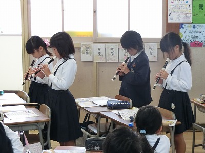 今までは左手だけでリコーダーの穴をおさえていましたが、「ファ」から下の音は右手が必要になります。しっかりと押さえないときれいな音が出ません。「山のポルカ」と言う曲で、前半は各自で練習です。ちょっと外れた音も聞こえていましたが、後半の列ごとの発表では、きれいな音で奏でることができていました。