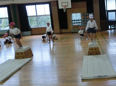 取材に行ったときは、まず、跳び箱の上に手を着いて、跳び箱の上に立ったり、または、そのまま跳躍して跳び箱の上に立ったりして、一呼吸おいてから、マットに向かってきれいな姿勢でジャンプ・着地をする練習でした。