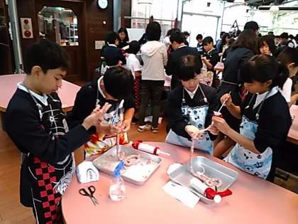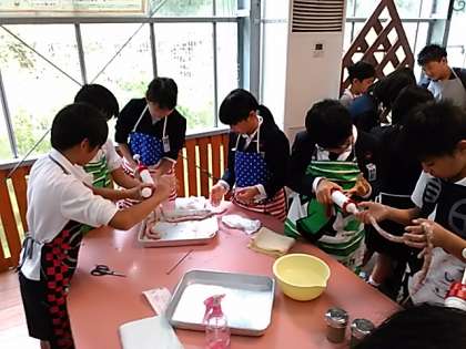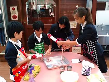お肉の生地作りができたら、ウインナーメーカーを使って、羊の腸に詰め込んでいきます。とっても面白い作業です。