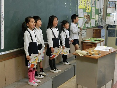 音読自慢の5人が前に出てきて音読を披露しました。よく通る声で、読み間違いもなく音読できていました。すでに、文を覚えてしまっている子もいました。その後、5人がリーダーとなり、全員で音読練習もしました。