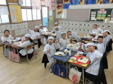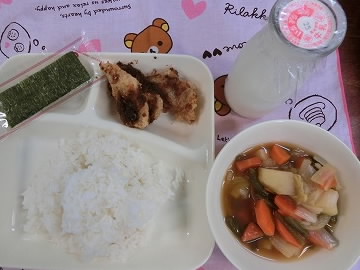 じゃがいもと野菜の煮物は、じゃがいも、こんにゃく、玉ねぎ、白菜、にんじん、三度豆のお野菜がたっぷり入っていて、甘めに煮られていました。子どもたちもたくさんお野菜を食べてくれていました。