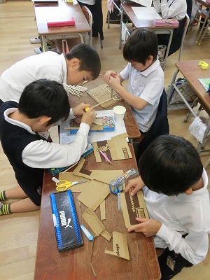 3〜4人がグループとなり、協力・相談しながらおもちゃを作っていました。