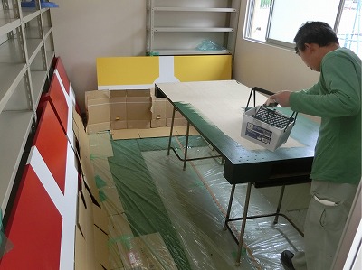 今日は「緑」のペンキを塗っていました。すでに「赤」「黄」は白のラインも入っていました。