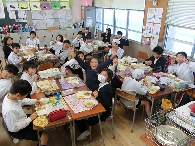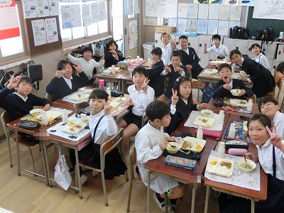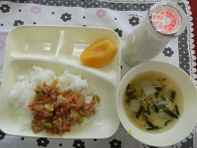 ピリ辛丼は、中華丼のピリ辛版のようでした。具材は、豚肉、玉ねぎ、にんじん、枝豆でです。でんぷんでとろみもつけてありました。しょうがとニンニクの風味が効いていて、豆板醤が辛みで入っていました。が、1年生でも、「辛くない〜」と言って、ごはんをがっつりと食べることができました。