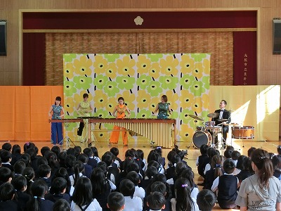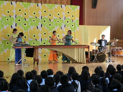 「マリンバ・カンパニー」の方に来校していただきました。物語や風景を音楽で表現されている曲を中心に、マリンバの心地よい音色の演奏が続きました。