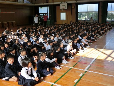 アンコールも含め全15曲の演奏でしたが、途中、マリンバの楽器紹介、バチの説明、4本バチでの演奏、児童6名が参加しての体験コーナー、打楽器の紹介、クイズコーナー、先生方も参加しての「ドレミの歌」の振付など、豊富な、そして、多彩なプログラムで、子どもたちは演奏に聞き入っていました。