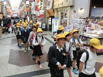また、ちょうど社会の学習で、スーパーマーケットや商店街について学習しているので、電車は「天神橋筋六丁目駅」で下り、天満駅まで日本一長い「天神橋筋商店街」を、先生から「ここは、○○屋さんやね。」「こっちは、◇◇屋さん。」とお店紹介してもらいながら歩きました。