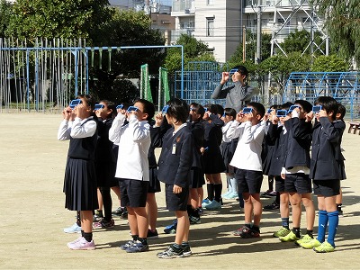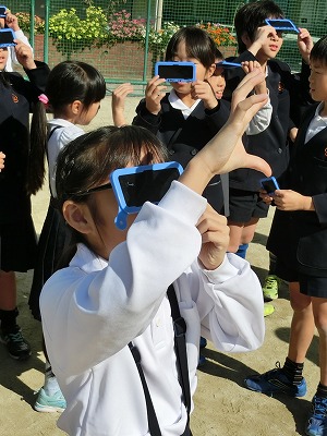 今日は「しゃ光板(太陽を見るためのメガネ)」を使って、太陽を観察していました。しゃ光板は真っ黒で、サングラスのように向こう側が見えません。子どもたちは、はじめのうちはおっかなびっくりな様子で、太陽を見ていました。