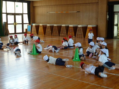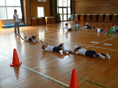 鉛筆のようになって床をゴロゴロ、アシカさんのポーズで腕を使って前進、かけっこなど、基礎運動を中心にしていました。