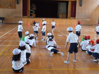 1年3組は、講堂で体育の授業をしていました。