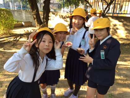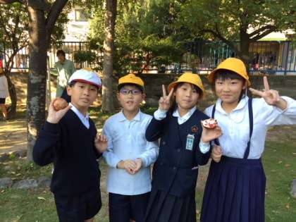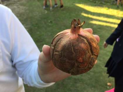今日は、4年生が管理作業員さんに手伝っていただいて、ザクロの収穫をしました。